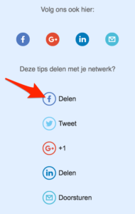 Waarschijnlijk gebruik je ze in je nieuwsbrief, de Social Share Buttons, oftewel de social media deelknoppen. Als lezers bijvoorbeeld op het Facebookknopje klikken, dan delen ze je nieuwsbrief op hun eigen Facebook tijdlijn.