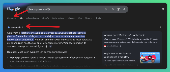 Sinds 2025 zie je bij veel informatieve zoekopdrachten de AI samenvatting verschijnen. Dat is eigenlijk de hedendaagse versie van de featured snippet. Google splitst op de achtergrond je zoekvraag op in deelvragen, zoekt daarbij de beste sites, en vat de essentie voor je samen. Met bronvermelding zodat je alsnog kunt doorklikken naar de website waar de informatie vandaan komt.