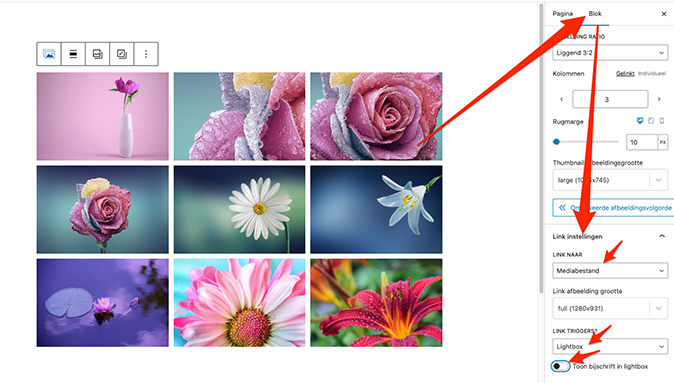 Dit blok bevat veel meer instelmogelijkheden dan het standaard WordPress Galerij blok.
